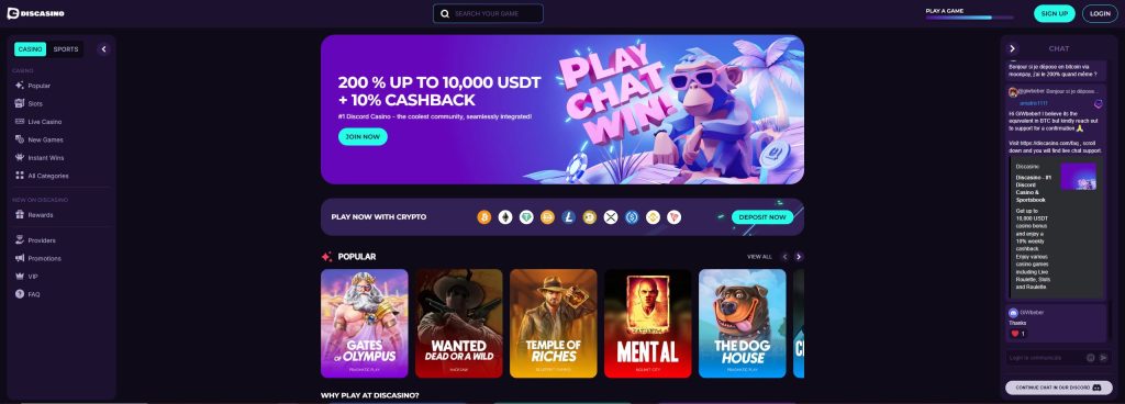 DisCasino integra una comunidad activa en Discord, lo que suma funciones sociales únicas a la experiencia de juegos casino online. Tienes soporte por chat en vivo y una licencia Anjouan Gaming para mayor transparencia.